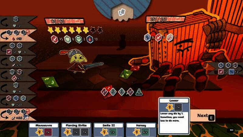 采用骰子驱动的回合制战斗模式。玩家需将骰子点数和技能卡牌相结合,运用连击、技能增益等策略击败敌人。比如特定技能要奇数或偶数骰子点数才能触发,装备升级还能解锁骰子拆分、点数强化等能力,形成多样战斗流派。