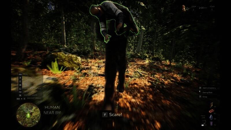 玩家可以在美丽的森林中展开探索,像大脚怪一样生活。捕捉并食用鱼类、昆虫等生物,在森林里寻觅蘑菇、浆果。搭建庇护所用于储存物品,以此熬过严酷的冬天。通过折断树枝、吓唬野生动物来获取额外积分,还能获得新的大脚怪技能,如大脚怪视觉、速度、攀爬和迷雾。同时要小心人类大脚怪猎人,他们会试图找到你并拍照,你可以偷走他们的物品来获得积分并完成任务。