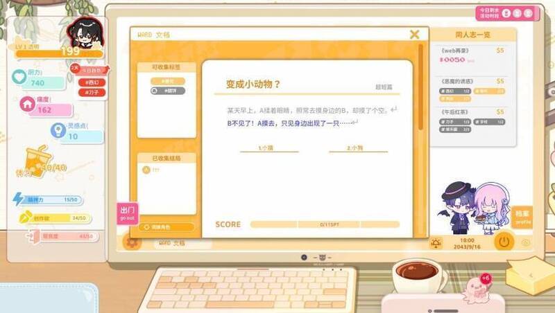 玩家扮演同人作者,白天外出收集创作灵感,夜晚将灵感转化为精彩故事。创作题材丰富多样,涵盖学校、娱乐圈、古风、ABO、西方魔法等,还能融入甜文、虐文、破镜重圆等多种元素。根据流行趋势和委托要求创作,不断增加粉丝数量,收获更多评论与喜爱,逐步在圈内崭露头角。
