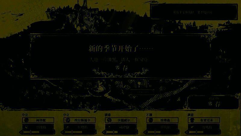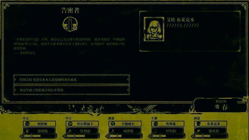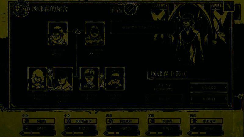五项指标:游戏的五项指标为愚昧/狂热/戒律/忏悔/服从,分别由五大家族维护,要维持数值在要求以上。连续两季低于规定数值游戏结束。选定不同属性家族顾问对五项指标有不同增益或减益效果,选顾问时要结合家族负责指标和顾问属性。