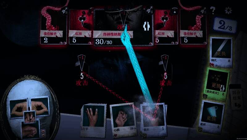卡牌战斗界面以定格动画呈现手的抓取、攻击动作,搭配低沉音效与氛围音乐,带来克苏鲁式精神污染体验。