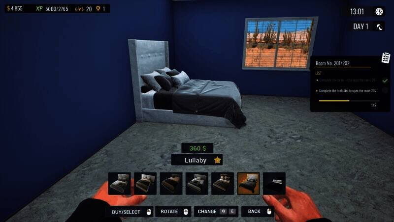 从客房到公共区域,玩家可以完全按照自己的审美来设计旅馆的风格。游戏提供了超过百种的家具和装饰物,支持对色彩、材质、布局进行深度定制,甚至能够打造主题套房,像复古风、极简主义风格等,以此吸引特定的客群。