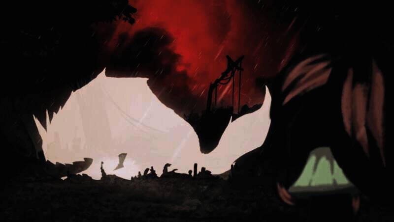 村庄的明亮色调与森林的血红阴影形成鲜明反差,隐喻着安全与危险的表里矛盾。
