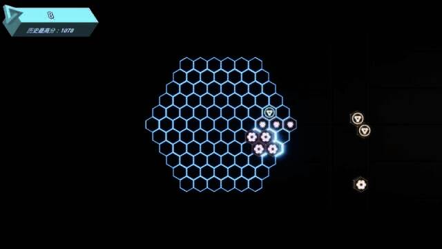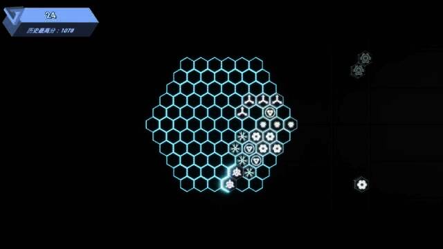 完成消除后,未被消除的方块留在大六边形里,形成新的格局。后续填入图案时,就要根据当前格局选择图案和位置,如此循环,直到游戏结束。