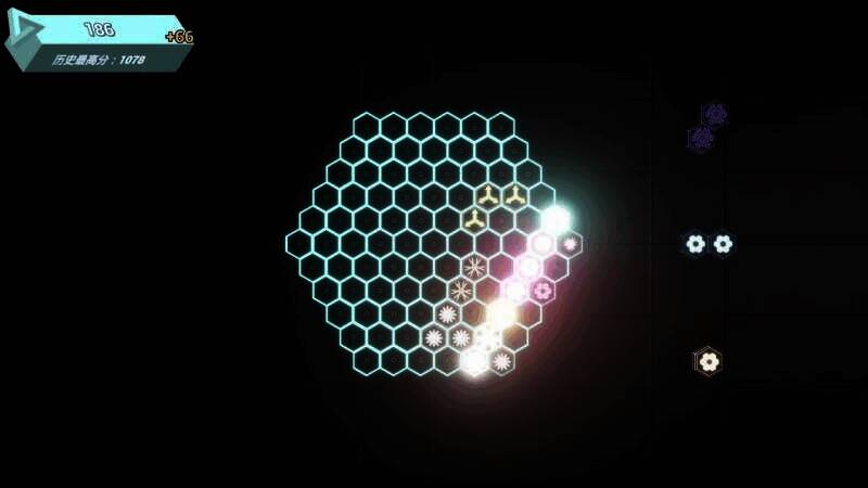 游戏主界面是一个大六边形棋盘,六边形的每一边由5个小六边形组成,整个棋盘共有61格空间。玩家需拖动系统自动输出的各种六边形组合,将其放置在大六边形的空白处,当这些组合排列成完整的一行或多行时就能消除得分,连续消除还会有额外的Combo加分。一旦棋盘上无法再摆放任意一个六边形组合,游戏就宣告失败。