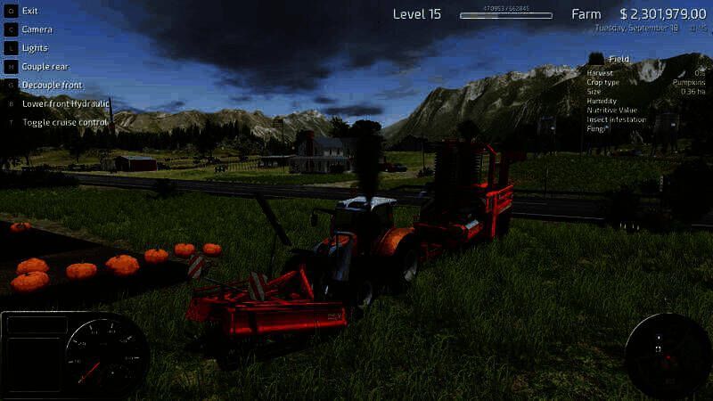 4、农作物成长之后余下的工作就是收割了,玩家需要使用联合收割机来收割农作物,然后把它放到土地旁边的拖车里。
