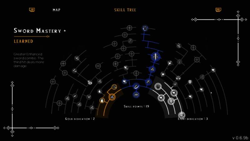 技能树超50项技能,依对光明或黄金之神的效忠进化。也可同时效忠二者,但无法用最强法术。游戏世界会随效忠改变,每个版本都藏着秘密与奖励。