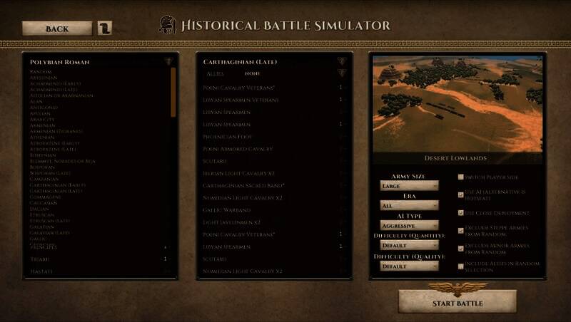自定义战斗选项丰富,包括军队列表、盟友、单位、军队规模等。玩家可随机化可选军队列表,也能按条件筛选随机军队。目前历史战斗有伊苏斯之战和拉菲亚之战,后续还会增加。