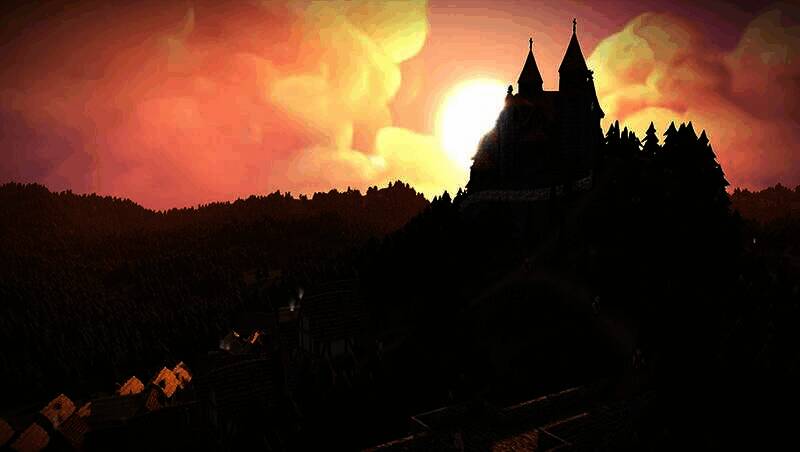 3D渲染的群山、森林和河流构成开阔背景,动态光影变化增强时间流逝感,晨雾中的磨坊和夕阳下的城堡氛围迥异。