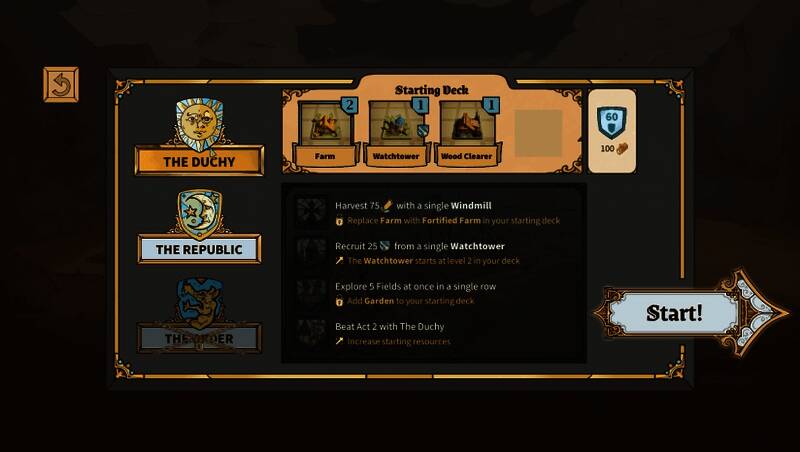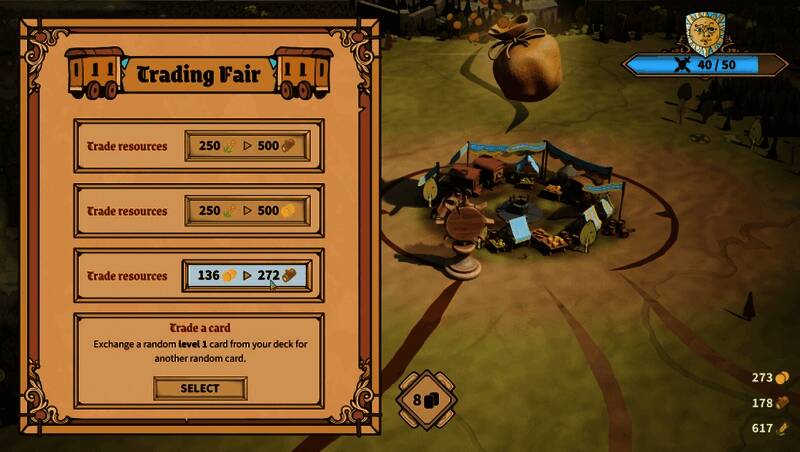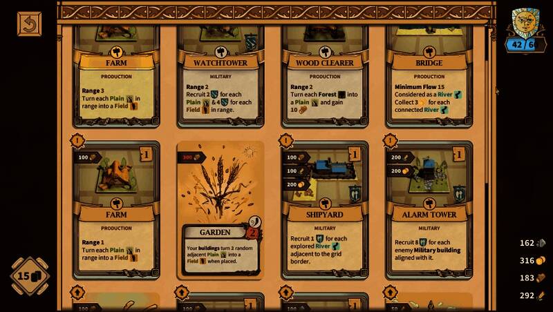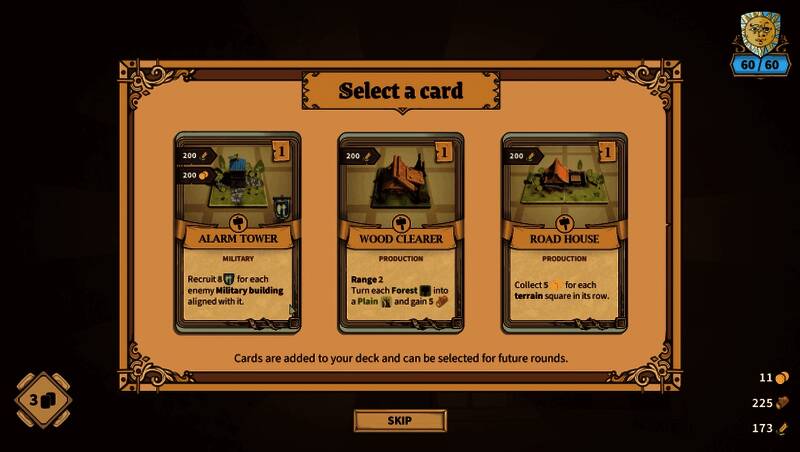 超过 110 张卡牌分为地形、建筑、军事三大类,能形成多样战术组合。像“樵夫”卡可把相邻森林转化为木材,“弓兵营”需依托平原地形发挥射程优势。卡牌升级与市场交易系统拓展了策略维度,玩家可通过局外成长解锁新卡组。