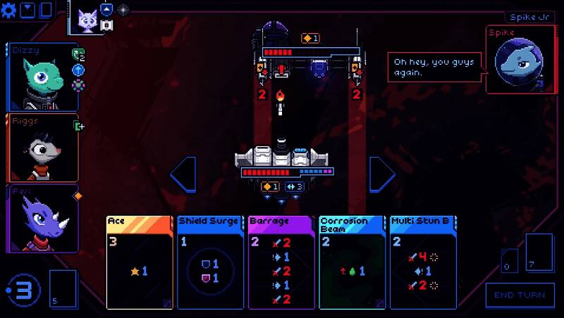 游戏的战斗系统是独特的单轴玩法。每回合开始时,玩家会从洗过的甲板上获得五张卡片和三个行动点,并通过扑克牌向船员发出指令,如升起护盾保护飞船、避免导弹和火炮的直接伤害、先发制人攻击使敌方武器失效等。同时,玩家可以看到下一轮敌方飞船的攻击或动作,从而提前计划好自己的行动。