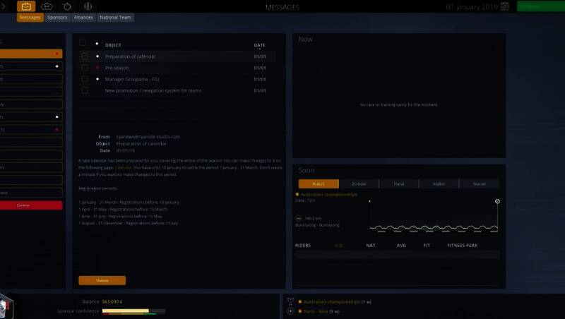 职业自行车队经理2019(Pro Cycling Manager 2019)是由Cyanide Studio制作发行的体育类模拟经营游戏。在游戏里,玩家需经营自己的职业自行车队,对队员进行训练,合理调配资金与各类资源,目标是在众多比赛中斩获佳绩。