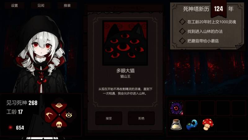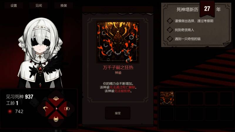 《死神模拟器(Trainee Death Simulator)》官方版是由Bone Nail制作并发行的角色扮演类模拟策略游戏。玩家扮演见习死神,通过收割灵魂偿还债务。游戏有随机抉择事件,比如摆烂、跟前辈赚外快、收集衣服换装等,且见习死神有无数次重来机会。