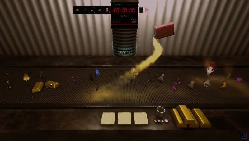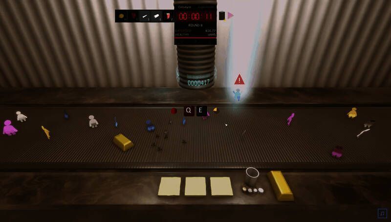 玩家在游戏中化身为一名在传送带旁工作的员工,需要收集对自己有用的物品,像金条、食物等。不过要格外小心,传送带上藏着一些大炸弹,可千万别吸进去。尤其要注意,必须收集金条,要是让它被送进焚烧炉,老板会不高兴,甚至可能会解雇你。