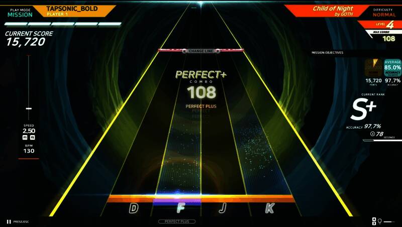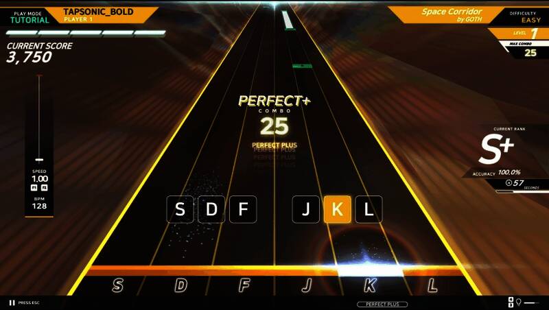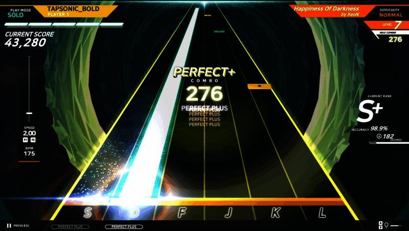 《TAPSONIC BOLD》英文免安装版是一款极富快节奏体验的音乐游戏。玩家在游戏里能够自行选择路径数量和难度,清晰的音符会从屏幕上方缓缓滑落,遇到长音符时需长按对应按键消除,若是会变换路径的长音符,则要长按按键并滑动至对应路径。