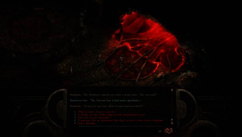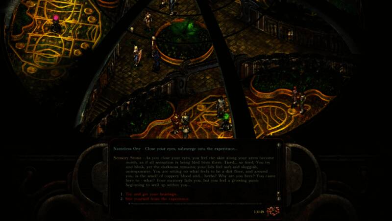 游戏依托高级龙与地下城规则,将背景设定在“异度风景”的战役模组里。整个宇宙由主物质位面、内层位面和外层位面共同构成。印记城是游戏的重要场景之一,它坐落于外域的无极尖峰之上,由神秘而强大的“痛苦女士”统治,被誉为“万门之城”和“笼子”,是多元宇宙的核心所在。玩家操控的失忆者“无名氏”从停尸房醒来后,开启了追寻前世秘密以及探究自己死而不朽原因的征程,在此过程中,会穿梭于多元宇宙的各个位面,与不同派系、种群的居民展开互动。