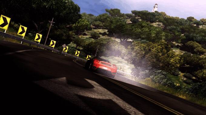 车模精度和材质出色,除车内建模稍逊,车表面质感十足,在阳光照耀下光彩夺目,仅欣赏跑车也是一种乐趣。车辆高速行驶时,在 HDR 支持下,场景和天空的色调与明暗度会细腻变化,适当的运动模糊带来强烈速度感,视觉体验华丽且真实。游戏场景大且细节到位,材质质量高,城市广告路牌清晰,野外植被表现良好,各区域风景多样,但因场景局限于一个岛,稍显重复。