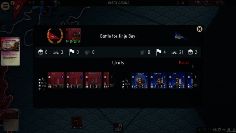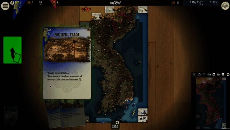 游戏涵盖成千上万的陆军单位、数百艘战舰(包括标志性的龟甲船)、非正规部队、叛军与突袭者等多种兵种。上百张卡牌与事件系统涉及天气变化、财政收入、人口忠诚度、外交关系、攻城战等多个层面,战斗系统尤其细致——海上作战包含炮击与登船作战,陆战则涵盖骑兵远程骚扰、弓箭与火炮火力压制、武士近战冲锋等丰富战术表现。