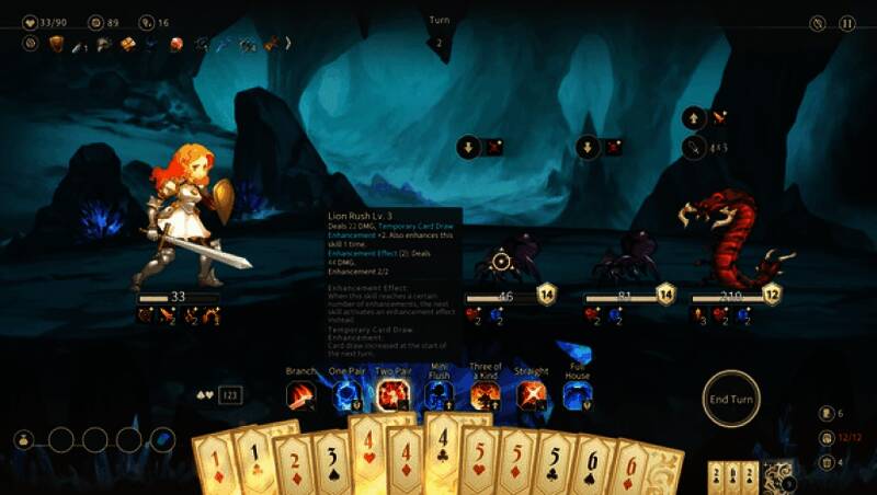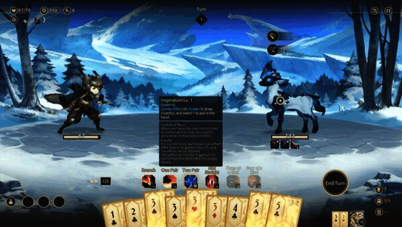 《星咏之诗》的核心玩法围绕扑克牌型构建战斗系统。玩家需通过打出对子、三条、同花顺等牌型来激活技能,进行攻击或防御。每种牌型对应不同效果,组合越复杂,技能威力越强。