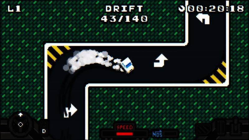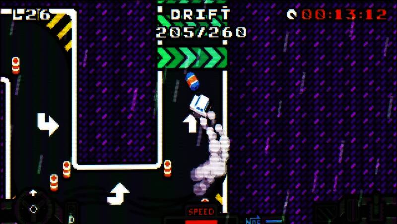 游戏采用俯视角像素风画面,以低多边形建模和饱和色调还原经典街机视觉风格。赛道色彩鲜明,车辆漂移时伴随动态烟尘特效,增强动作反馈感。音效设计融合电子合成器音乐与轮胎摩擦声,进一步强化90年代街机厅的沉浸氛围。虽无写实画质,但风格化表现与玩法高度统一,赋予游戏独特的怀旧魅力。