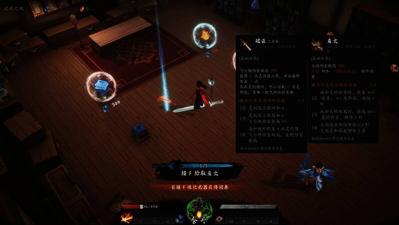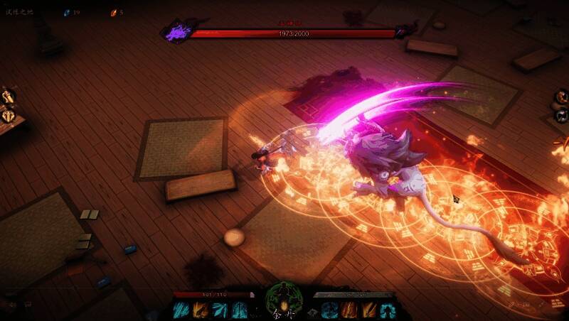 本作采用经典的房间推进式结构:每击败一个房间内的全部敌人后,玩家可从随机掉落的武器、技能或法宝中选择一项强化自身。每五个普通房间后便会遭遇一位机制独特的Boss,胜利即可进入更高难度的世界层级。即使失败也不必重头开始——通过消耗“精粹”(黄色晶石)可永久升级天赋树,解锁新剑招、提升基础属性,甚至获得全新武器与法宝,真正实现“死亦有进”的Roguelite体验。