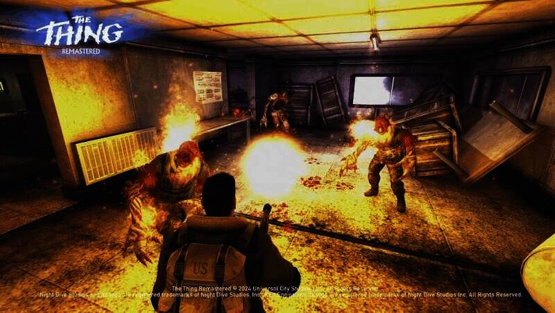 《怪形:重制版(The Thing: Remastered)》是一款于 2024 年 12 月 5 日发行的动作类生存恐怖射击游戏。该游戏由 Nightdive Studios 和 ComputerArtworks 共同开发,Nightdive Studios 负责发行。其灵感源自 1982 年的同名恐怖电影,玩家将扮演 J.F. 布雷克上尉,带领美国特种部队救援队前往南极 31 号前哨站,调查美国科研团队的神秘死亡事件,在那里会遭遇能变成人类模样的外星生物。