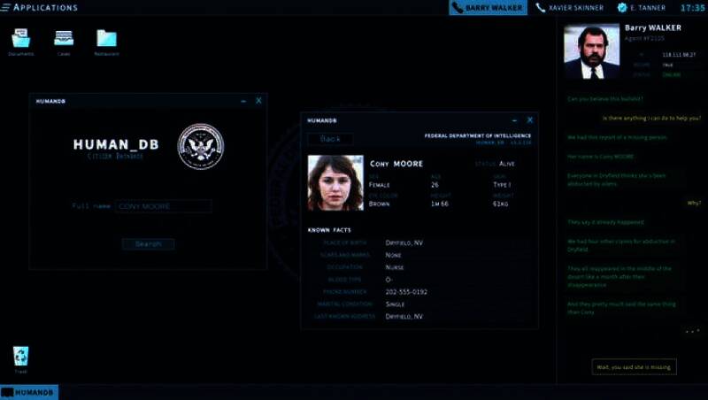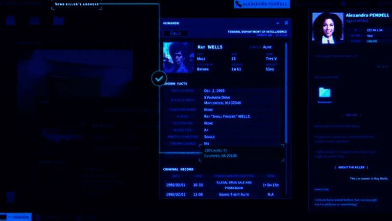 当外勤特工需要协助时,玩家要为他们提供后勤支持,包括确认线索、搜寻数据库、指认凶手等。玩家需要在公民信息数据库中,查找与案件相关人员的身份信息、联系方式等;在确认凶手时,玩家要综合各种线索,从多个嫌疑人中准确指认。