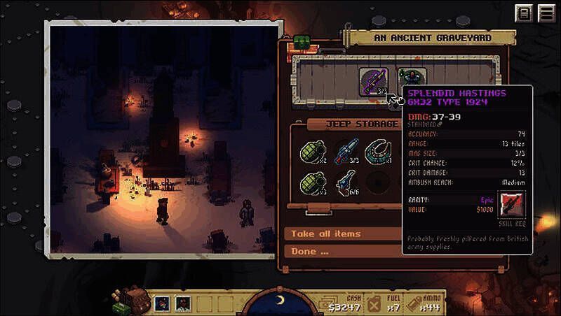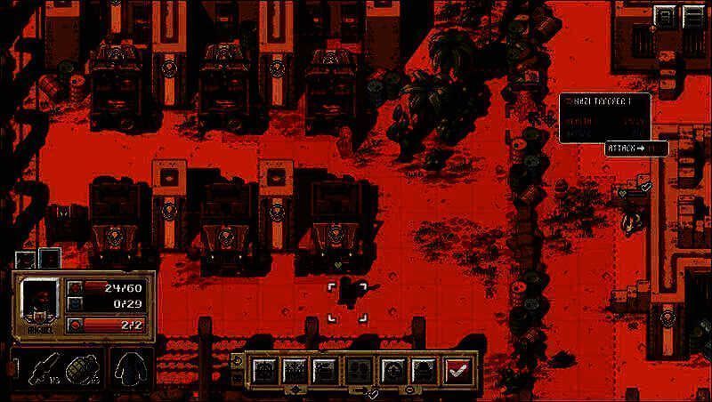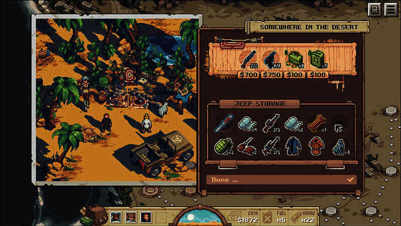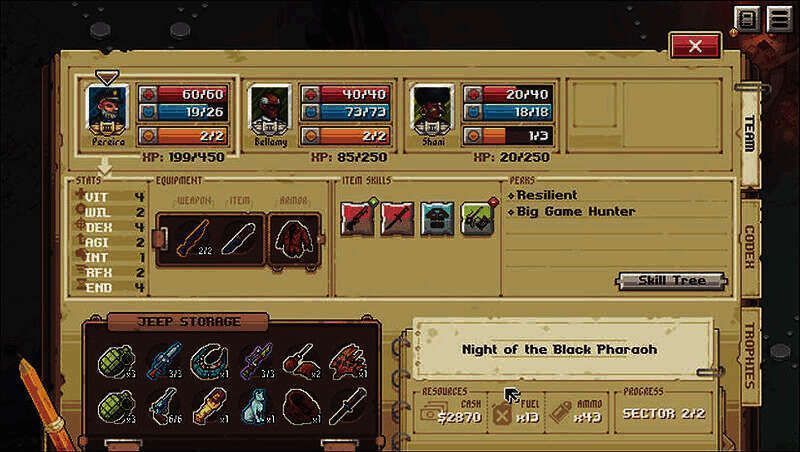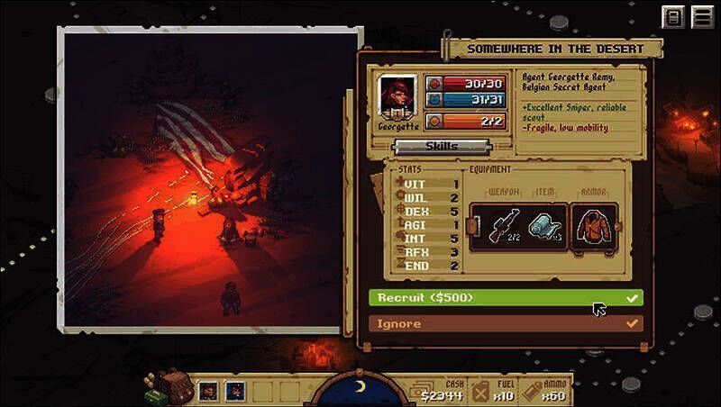 武器弹药并非无限供应,霰弹枪只有3发弹夹,需要消耗回合来填装子弹。角色的汽油量、子弹量等资源在出生时就自带,如果在冒险过程中没有得到补充,可能会面临全体步行、进行肉搏战斗的情况。战斗中,靠近掩体会有防御加成,而且没有奇怪的MISS机制,命中率比较可靠。