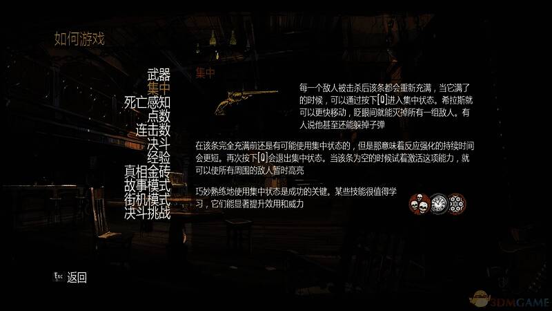 主角拥有多种技能,比如专注模式能让瞄准变得更容易,死亡感知技能可以帮助玩家躲避敌人的攻击甚至子弹。此外,还有远程系、近战系和双持系等3系技能树供玩家升级和发展,以提升角色的能力。