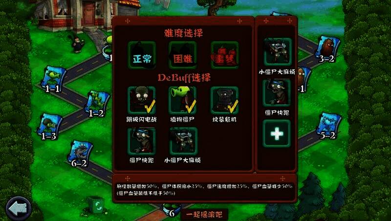 游戏设置了多种难度,从简单的新手难度到极具挑战性的噩梦难度,满足不同玩家的需求。同时还有各种debuff可供选择,如减少阳光获取、加快僵尸速度等,增加游戏的挑战性和趣味性。想要挑战自我的玩家,可以在高难度下选择强力debuff,体验紧张刺激的战斗。